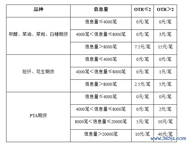 中国网财经5月21日讯今日,郑州商品交易所(简称:郑商所)发布相关通知表示,根据《郑州商品交易所期货结算管理办法》第二十七条规定,经研究决定正规股票配资app,自2024年5月31日当晚夜盘交易时起,对甲醇、白糖、菜油、菜粕、短纤、花生、PTA期货合约申报费收费标准进行调整,具体如下: