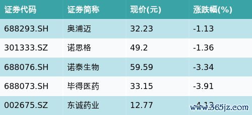 截至收盘短线股票推荐,CRO/CMO主题涨跌幅最高的五只股票为:奥浦迈(688293.SH)、诺思格(301333.SZ)、诺泰生物(688076.SH)、毕得医药(688073.SH)与东诚药业(002675.SZ)。详情见下表: