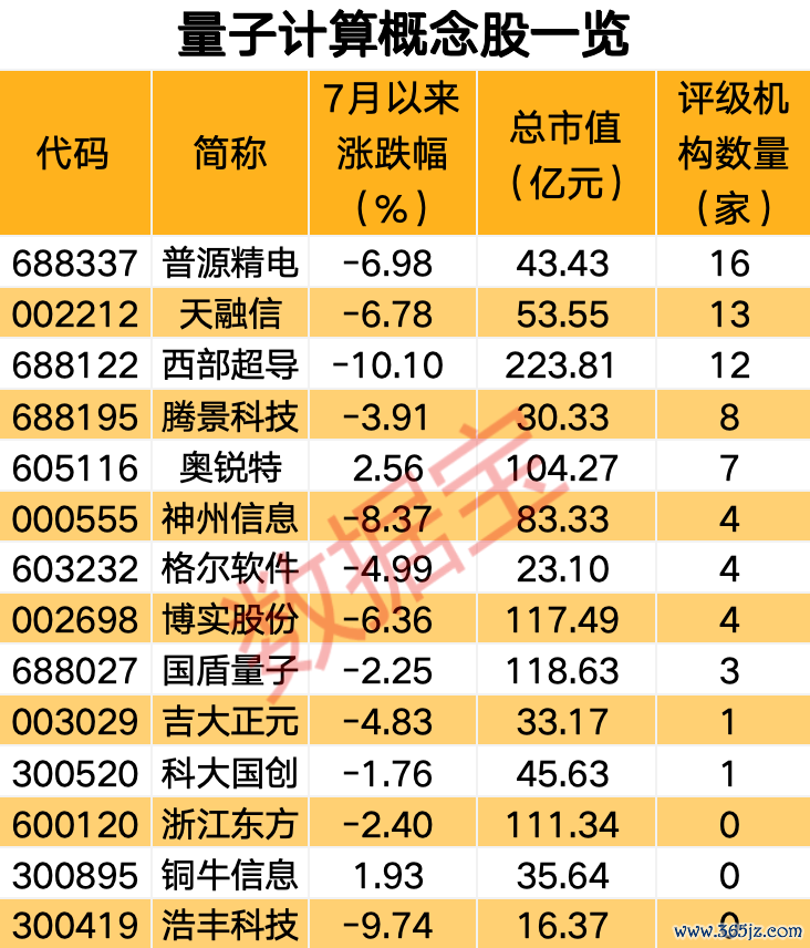A股中,布局量子计算的个股共有14只,部分个股获得机构密切关注,普源精电、天融信、西部超导评级机构家数均在10家以上。